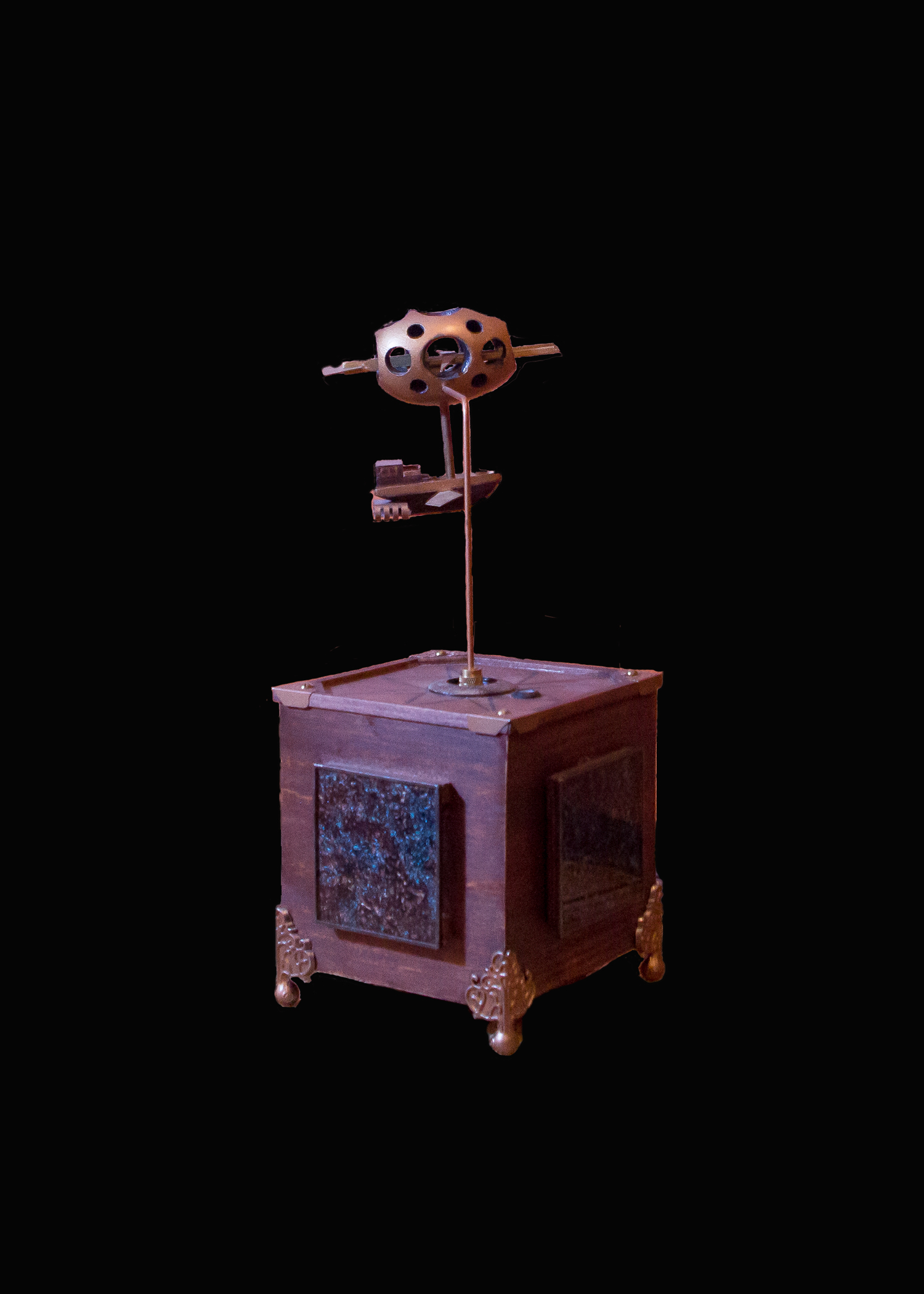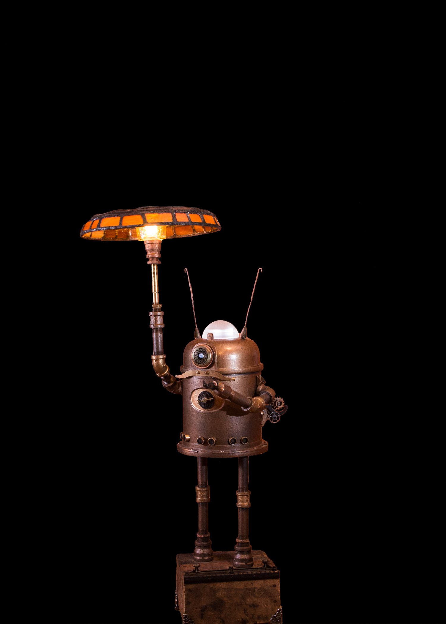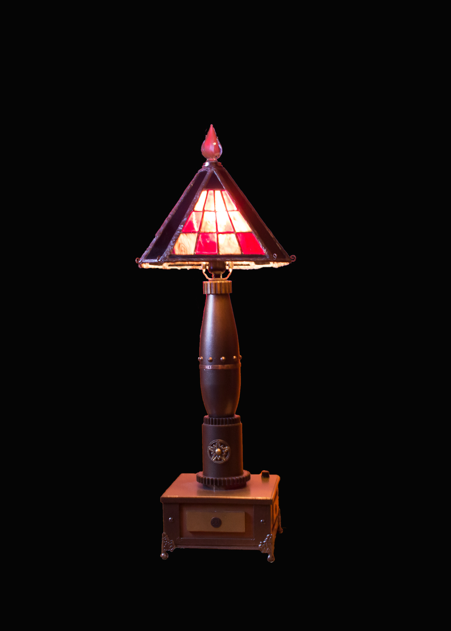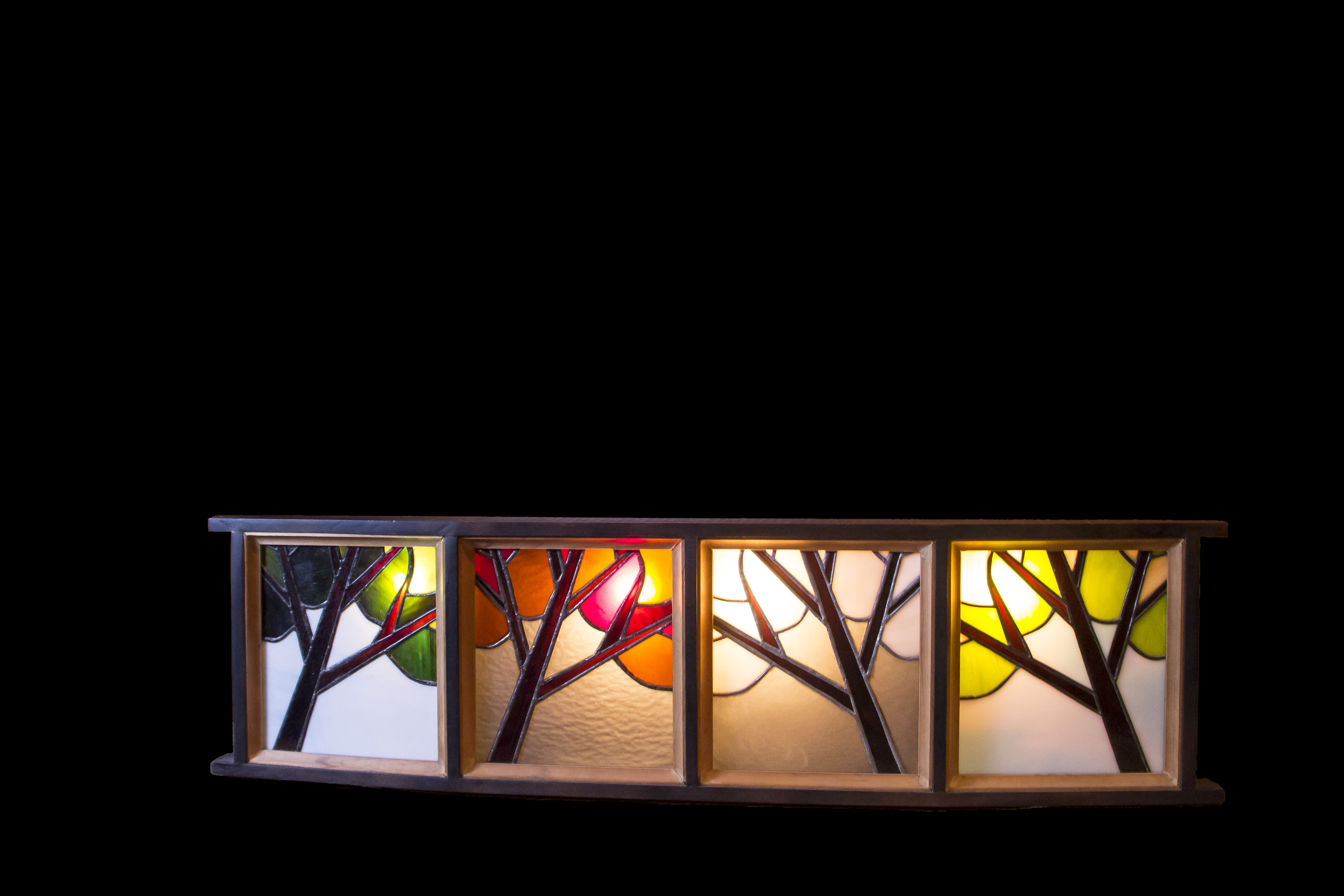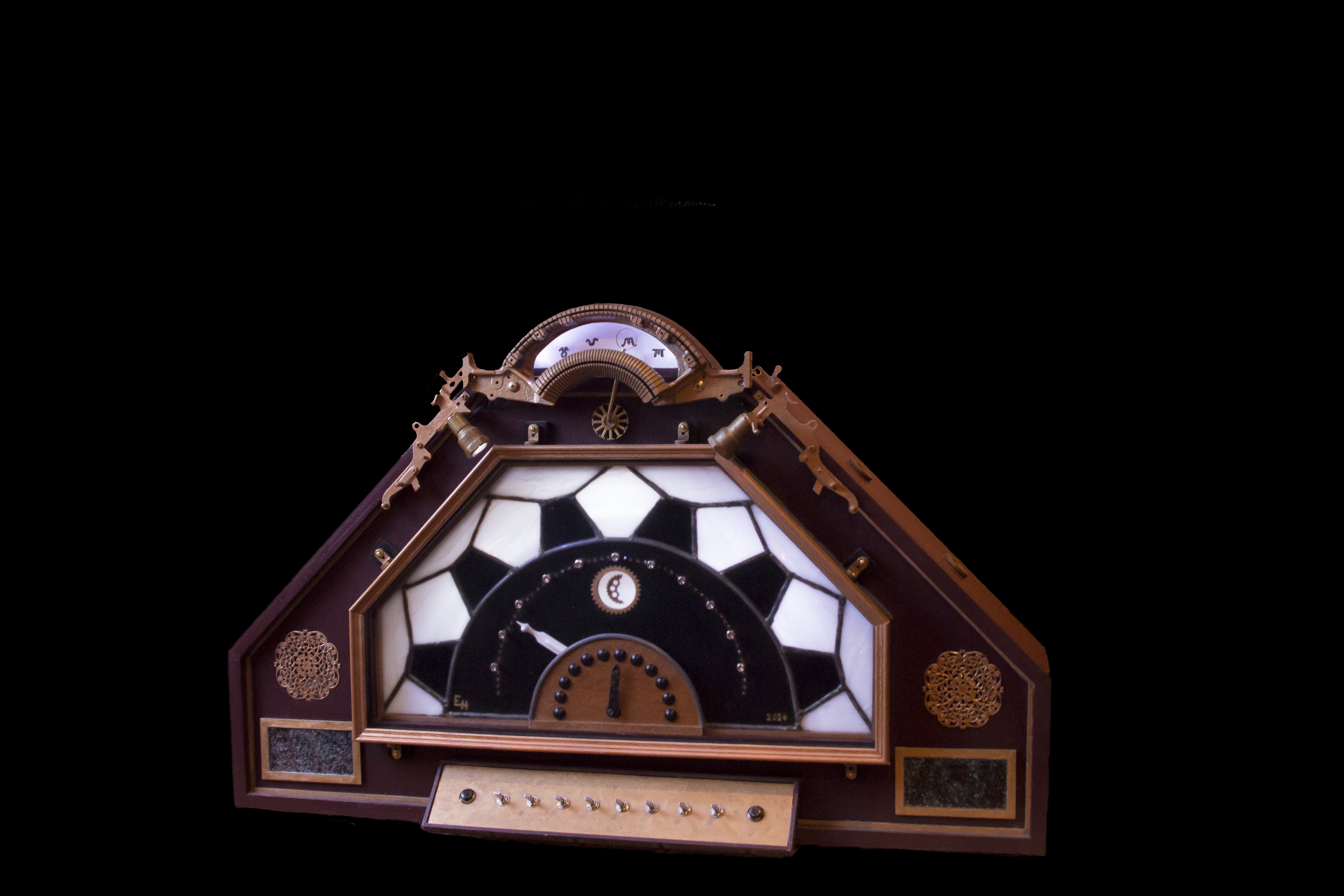 He works with a variety of media, including stained glass, wood, acrylics, and polymer clay. He also frequently incorporates electrical features into his art.